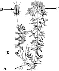 На рисунке буквами обозначены органы Зверобоя продырявленного.