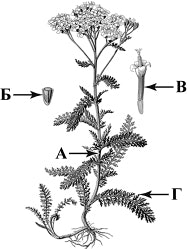 На рисунке буквами обозначены органы Тысячелистника обыкновенного.