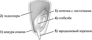 Из каких структур семени, обозначенных на рисунке «Семя» цифрами 1–5, развиваются части проростка, обозначенные на рисунке «Проросток» буквами А и Б?