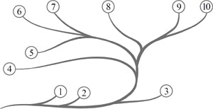 1 – Зелёные водоросли 2 – Красные водоросли 3 – Бурые водоросли 4 – Мхи 5 – Плауны 6 – Папоротники 7 – Хвощи 8 – Голосеменные 9 – Однодольные 10 – Двудольные