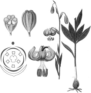На рисунке изображены цветок Лилии саранки и его отдельные элементы.