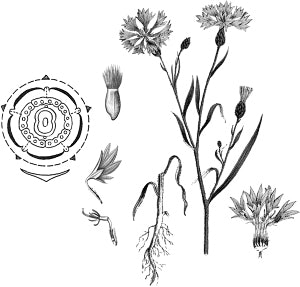 На рисунке изображены цветок Василька синего и его отдельные элементы.