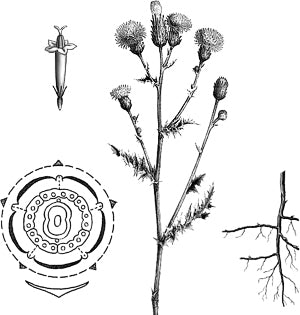 На рисунке изображены цветок Бодяка полевого и его отдельные элементы.