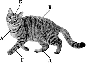 12.1. Установите соответствие между частями тела кошки, обозначенными буквами (А–Д) на рисунке, и их названиями.