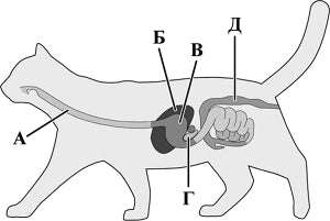 16.1. На рисунке представлена пищеварительная система кошки. Установите соответствие между отделами пищеварительной системы, обозначенными буквами (А–Д) на рисунке, и их названиями.