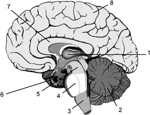 Какой цифрой на рисунке обозначен продолговатый мозг?