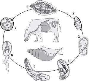 А) заражение промежуточного хозяина Б) личиночная стадия В) оплодотворённая яйцеклетка (яйцо) Г) развитие в печени окончательного хозяина Д) активно плавает в воде Е) имеет гермафродитную половую систему