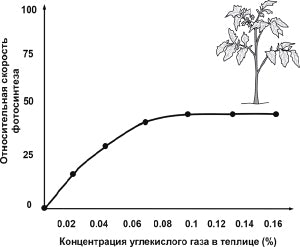 Учёный изучал влияние различных экологических факторов на процесс фотосинтеза. Свой эксперимент исследователь проводил в специальной теплице, где были высажены 300 растений томата сорта Шапка Мономаха. В герметичную теплицу с определённой периодичностью закачивался воздух с различным количеством углекислого газа. С помощью датчиков учёный фиксировал показатели скорости фотосинтеза, которые приведены на графике ниже.