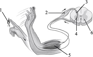 Выберите три верно обозначенные подписи к рисунку, на котором изображено строение рефлекторной дуги человека.