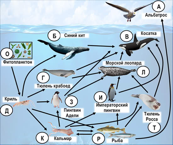 Составьте пищевую цепь из четырёх организмов, в которую входит тюлень крабоед. В ответе запишите соответствующую последовательность букв, которыми обозначены организмы на схеме. Цепь начните с продуцента.