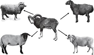 На схеме изображены породы овец, полученные селекционерами от дикого предка.