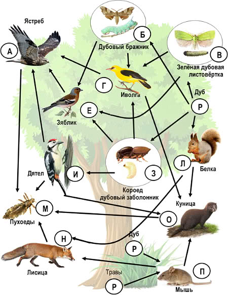 Проанализируйте биотические отношения между организмами экосистемы леса. Как изменится численность дубовых бражников и ястребов, если в течение нескольких лет происходило сокращение численности зябликов?