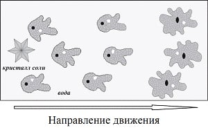 В изображённом на рисунке опыте экспериментатор поместил кристалл соли в каплю воды с живыми амёбами. Через некоторое время все простейшие стали двигаться в одном направлении.