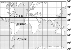 1) 30° с.ш. 2) 20° ю.ш. 3) 55° ю.ш.