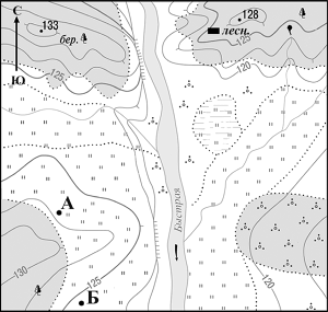 Туристы из групп А и Б разместились на ночлег в окрестностях реки Быстрой в точках, обозначенных на карте соответствующими буквами. Туристы из группы А развели большой костёр.