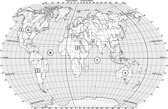 Запишите названия океанов, обозначенных на карте буквами В и Г.