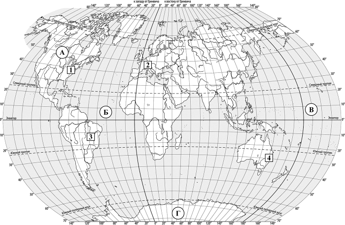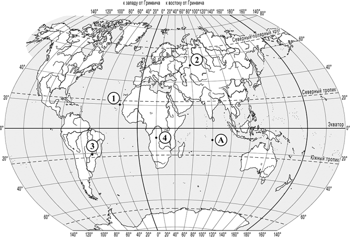 Задания 1–2 выполняются с использованием приведённой ниже карты мира.