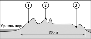 На острове в пунктах, обозначенных на рисунке цифрами 1, 2 и 3, были одновременно проведены измерения атмосферного давления. Расположите эти пункты в порядке повышения в них атмосферного давления, начиная с пункта, в котором атмосферное давление было самым низким. Запишите в ответе получившуюся последовательность цифр.