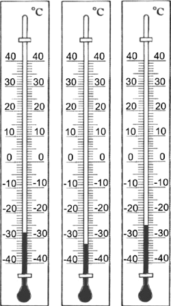 Ниже приведены изображения термометра, при помощи которого велись наблюдения за изменением температуры воздуха в течение суток. Сравните показания термометра в разное время дня.
