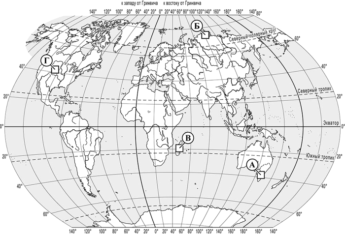 1) 30° с. ш. 2) 20° с. ш. 3) 50° ю. ш.