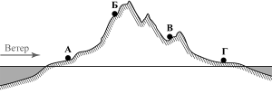 На рисунке буквами А–Г обозначено расположение на острове четырёх метеостанций. Стрелкой показано направление ветра, преобладающего в течение года.