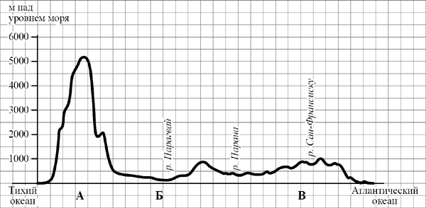 На уроке географии Сергей построил профиль рельефа Южной Америки, представленный на рисунке. По какому из отрезков, проведённых на карте вдоль трёх параллелей, пересекающих материк Южная Америка, построен профиль рельефа, представленный на рисунке? Укажите в ответе эту параллель.