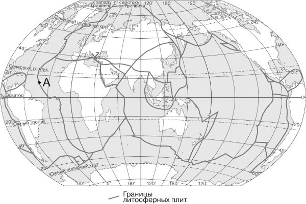 Определите, какой процесс происходит на границе литосферных плит в точке, обозначенной на карте буквой А.