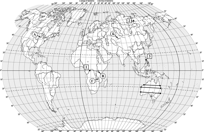 Задания 1–3 выполняются с использованием приведённой ниже карты мира.