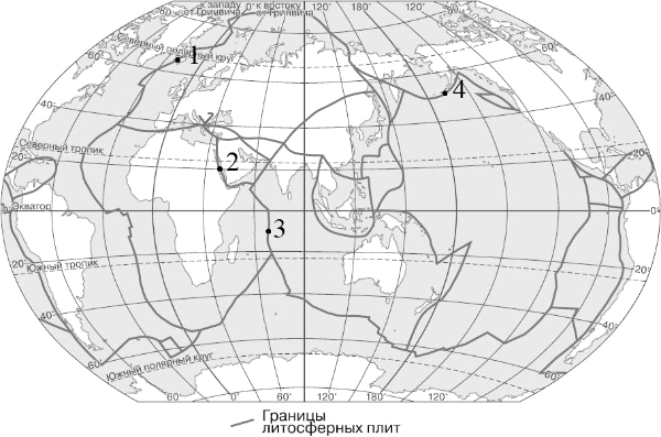 Определите, в какой из обозначенных на карте цифрами точек на границе литосферных плит происходит процесс образования островных дуг.