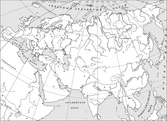 Отметьте на контурной карте знаком «✅» четырёхугольник (его центр), образованный градусной сеткой (параллелями и меридианами), в котором располагался древний город Рим.