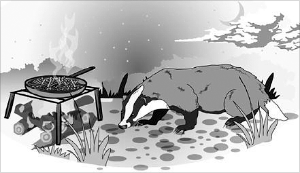 Однажды вечером в траве у костра начал сердито сопеть какой-то зверь. Он бежал и голосил на весь лес. У нас на стоянке горел костёр. Через год я встретил барсука со шрамом на носу. Из зарослей вылез маленький барсук и сделал шаг к картошке. Около пня, спиной к нам, стоял барсук.