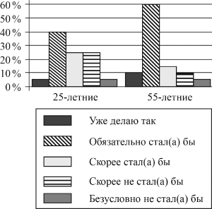 В ходе социологического опроса 25-летних и 55-летних граждан им был задан вопрос: «Один из экологически целесообразных способов переработки мусора предполагает сортировку бытовых отходов. Если бы у Вас была возможность выбрасывать каждый вид мусора в отдельный контейнер, стали бы Вы сортировать Ваш мусор?»