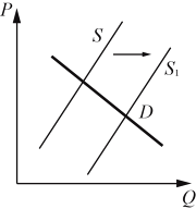 На графике изображено изменение ситуации на потребительском рынке легковых автомобилей в стране Z. Кривая предложения переместилась из положения S в положение S1 при неизменном спросе D. (На графике P – цена товара; Q – количество товара.)